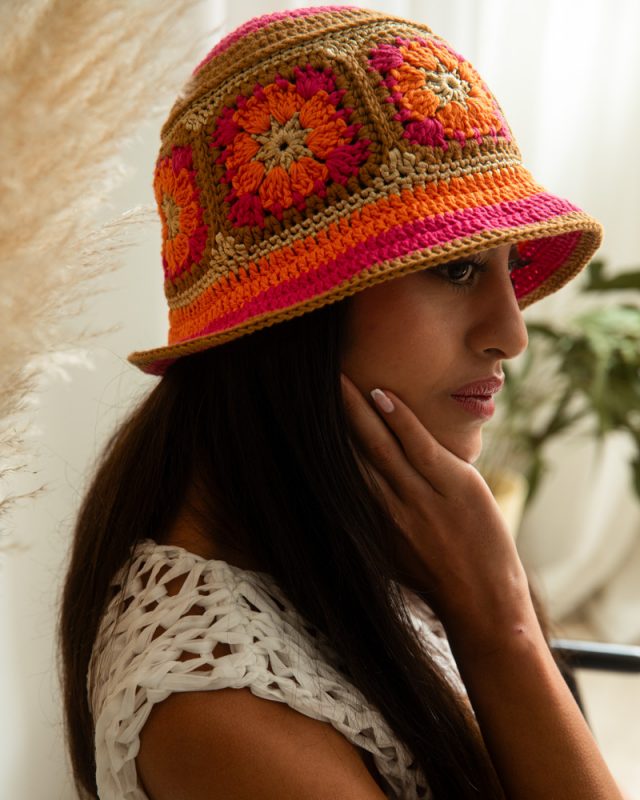 Knitted summer hat, patchwork of flowers, orange & fuchsia & beige