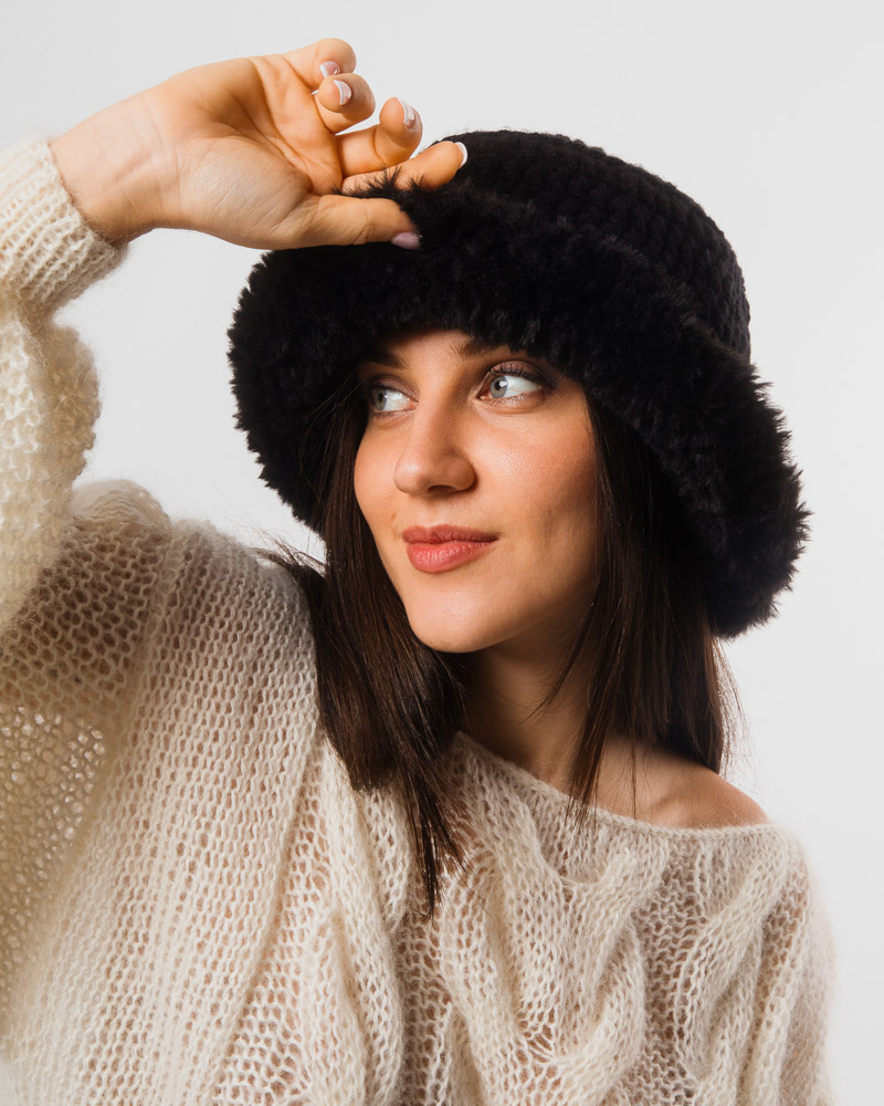 Crochet Bucket Hat, Eco wool & fur, White & Beige & Brown
