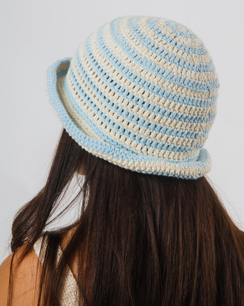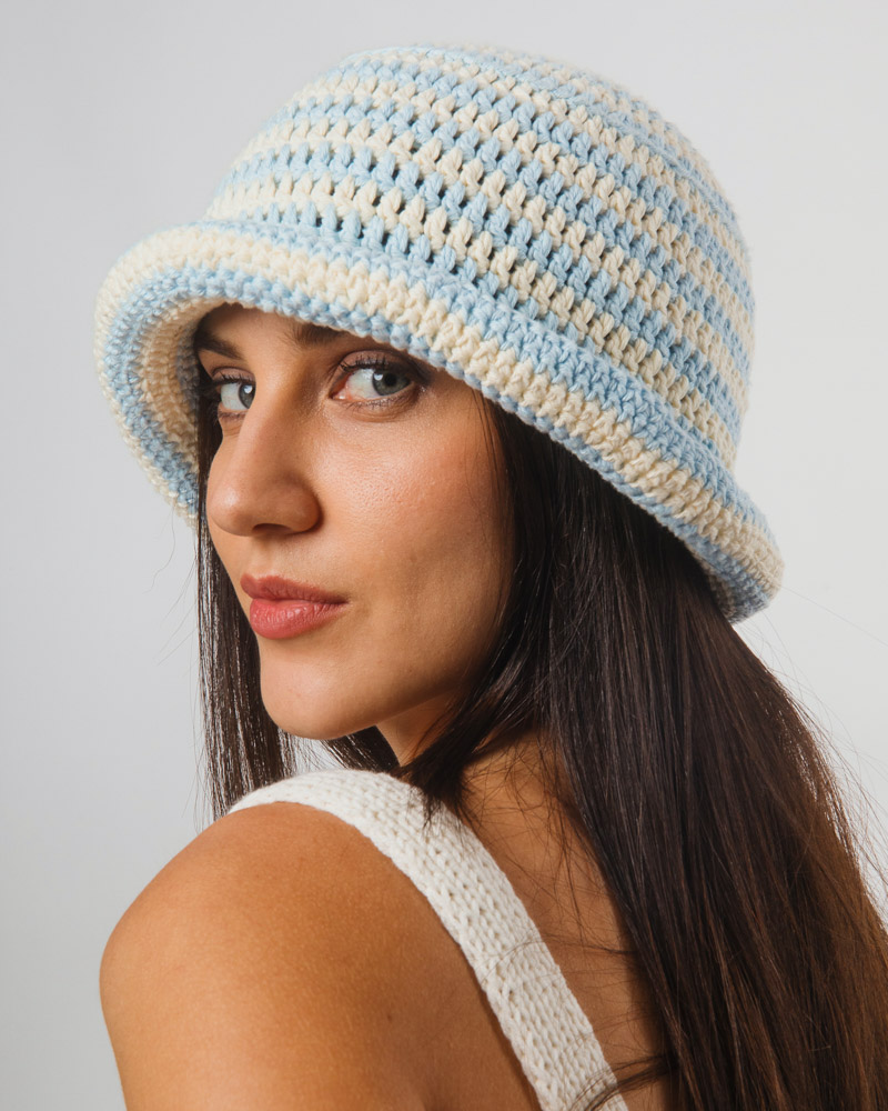 Crochet Bucket Hat, Eco wool & fur, White Blue Beige