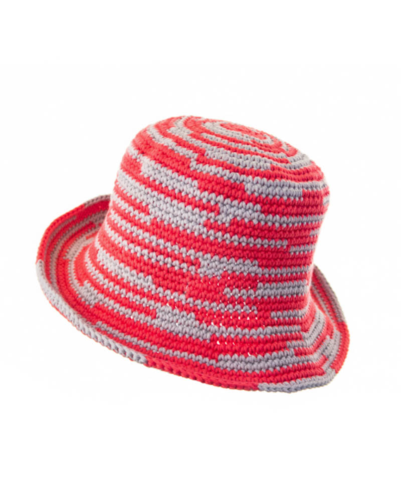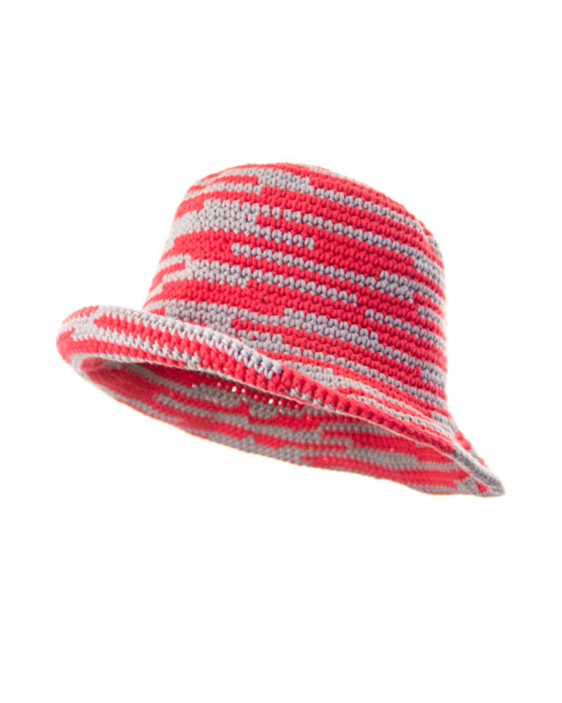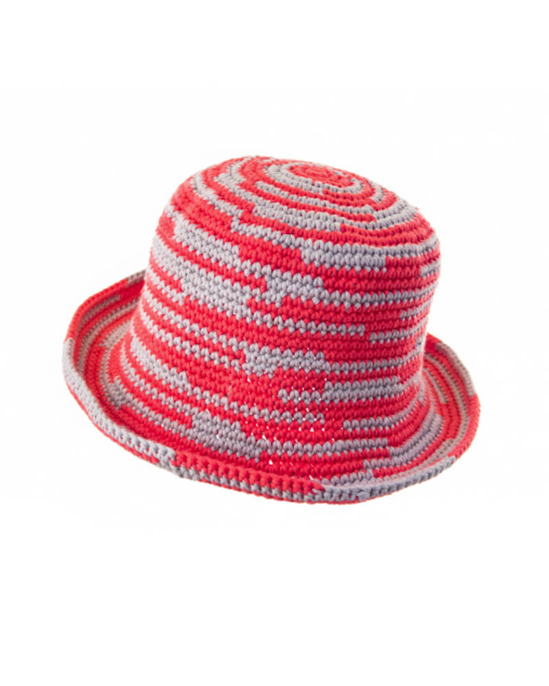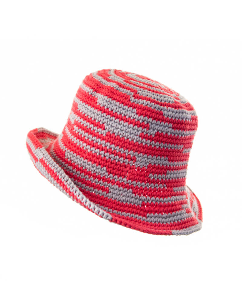 Asymmetrical striped knitted summer hat, fucsia & grey