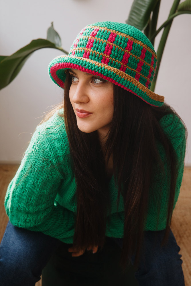 Bucket Hat with squares and stripes, Green, Fuchsia & Beige
