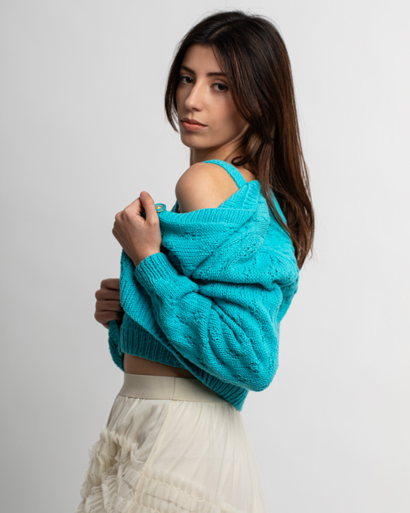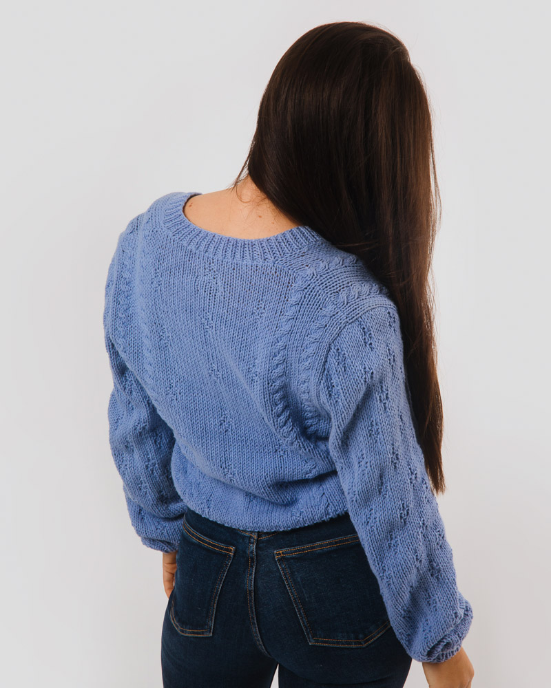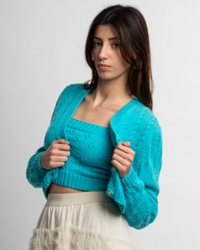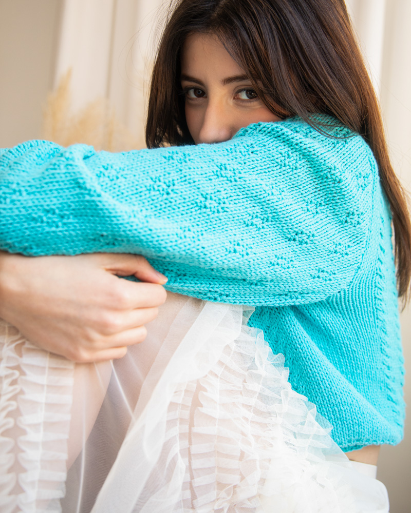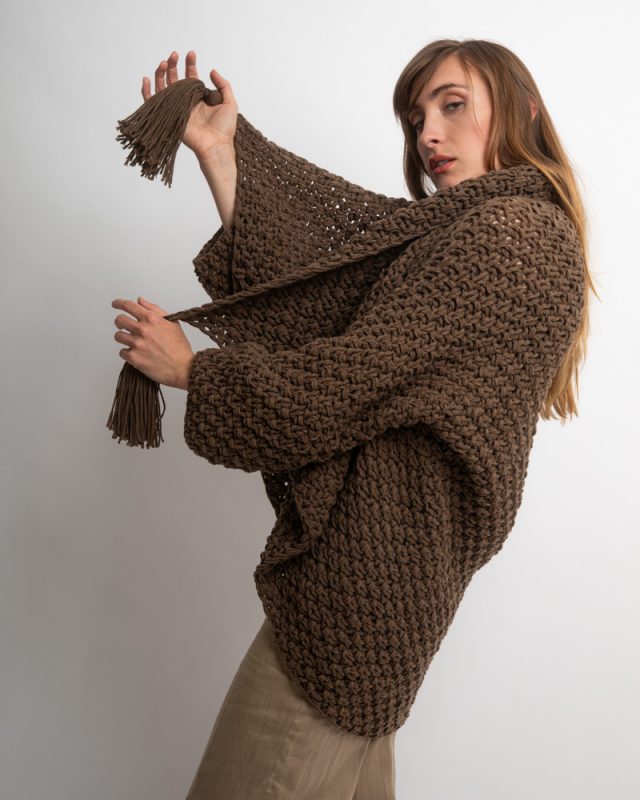 - Elastic 1×1 rib on the cuffs and bottom of the cardigan.