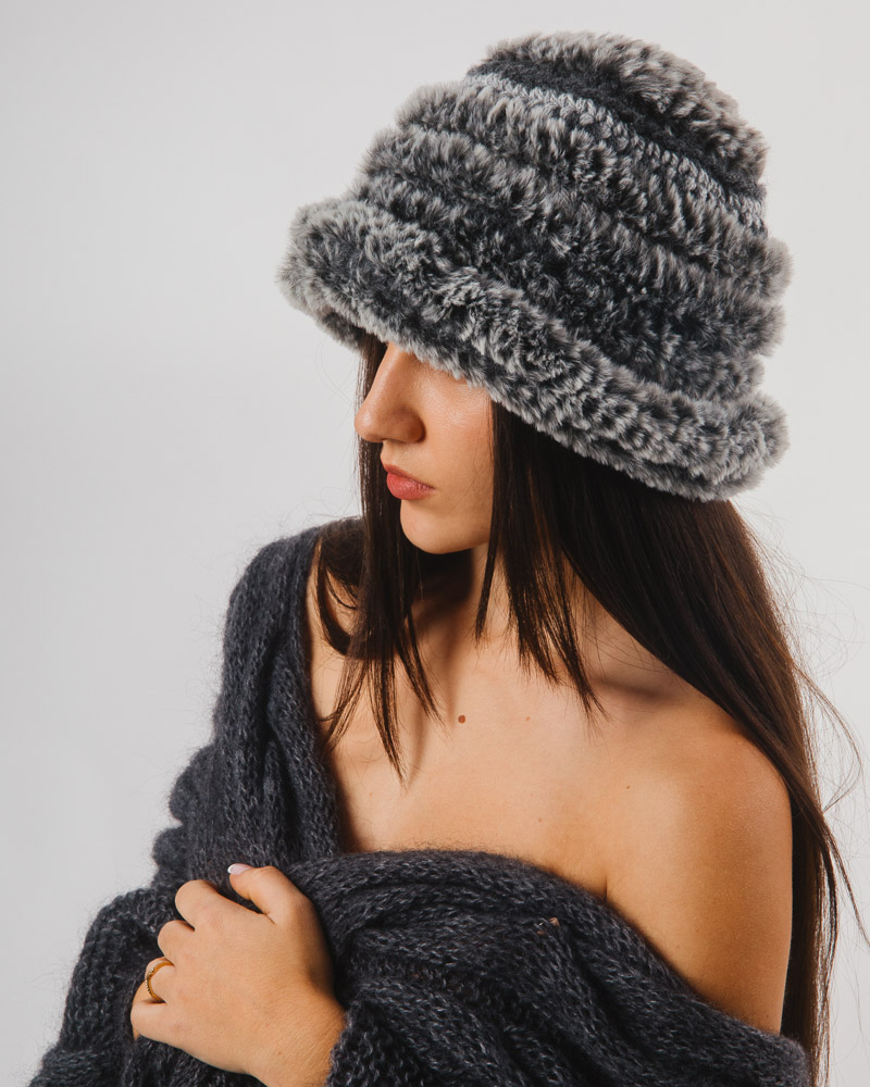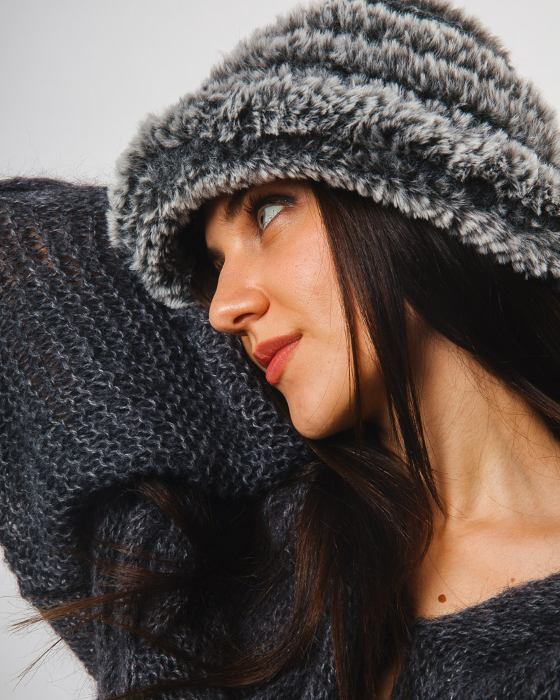 Crochet Bucket Hat, Eco wool & fur, Grey & Darc grey