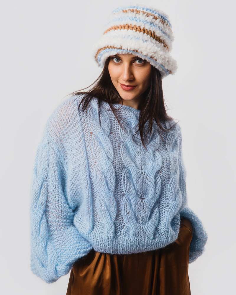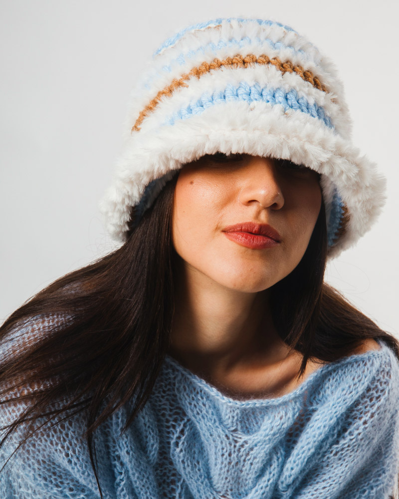 Crochet Bucket Hat, Eco wool & fur, White Blue Beige
