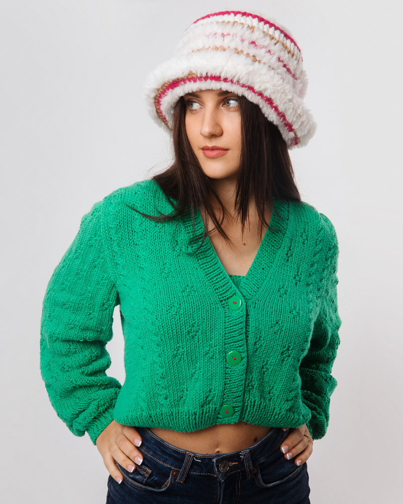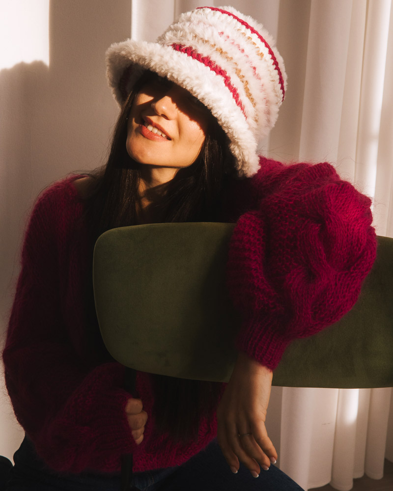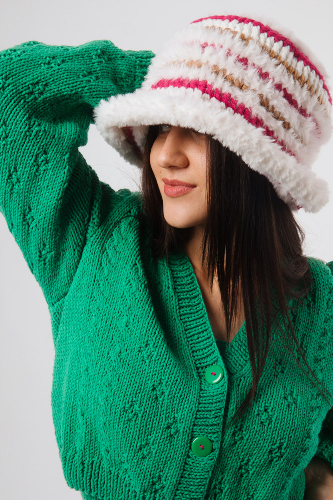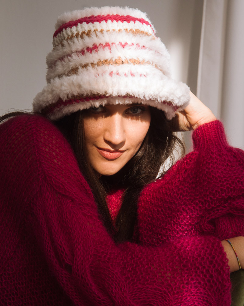 Crochet Bucket Hat, Eco wool & fur, White Fucsia Beige