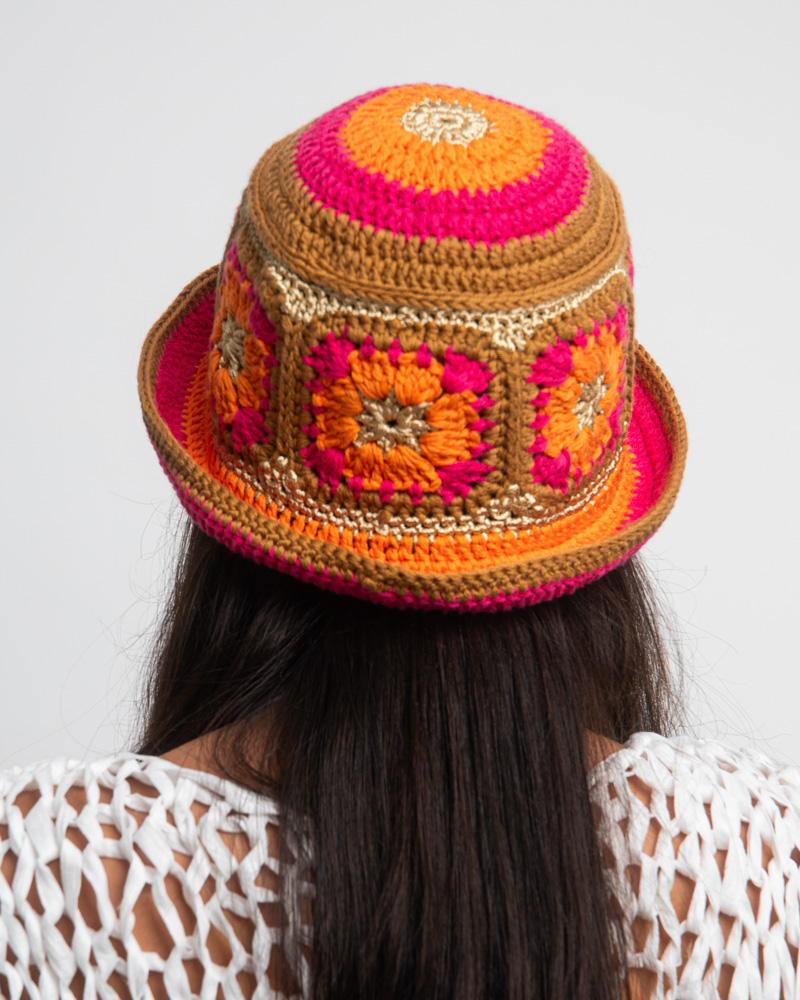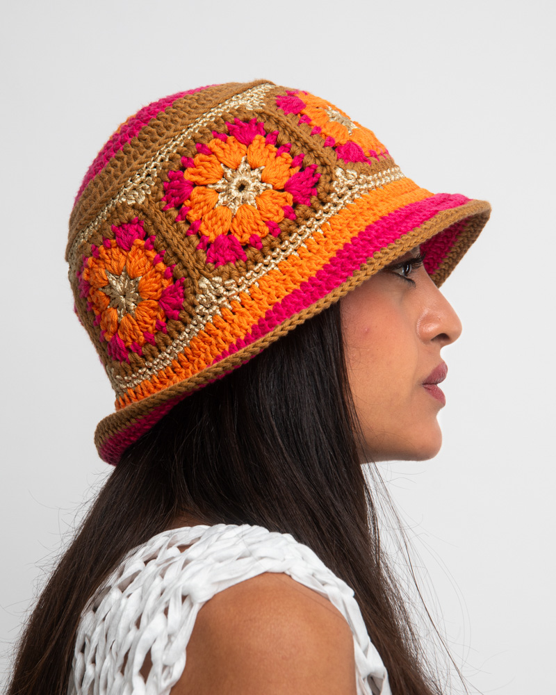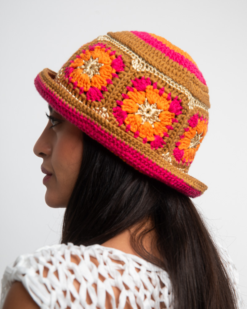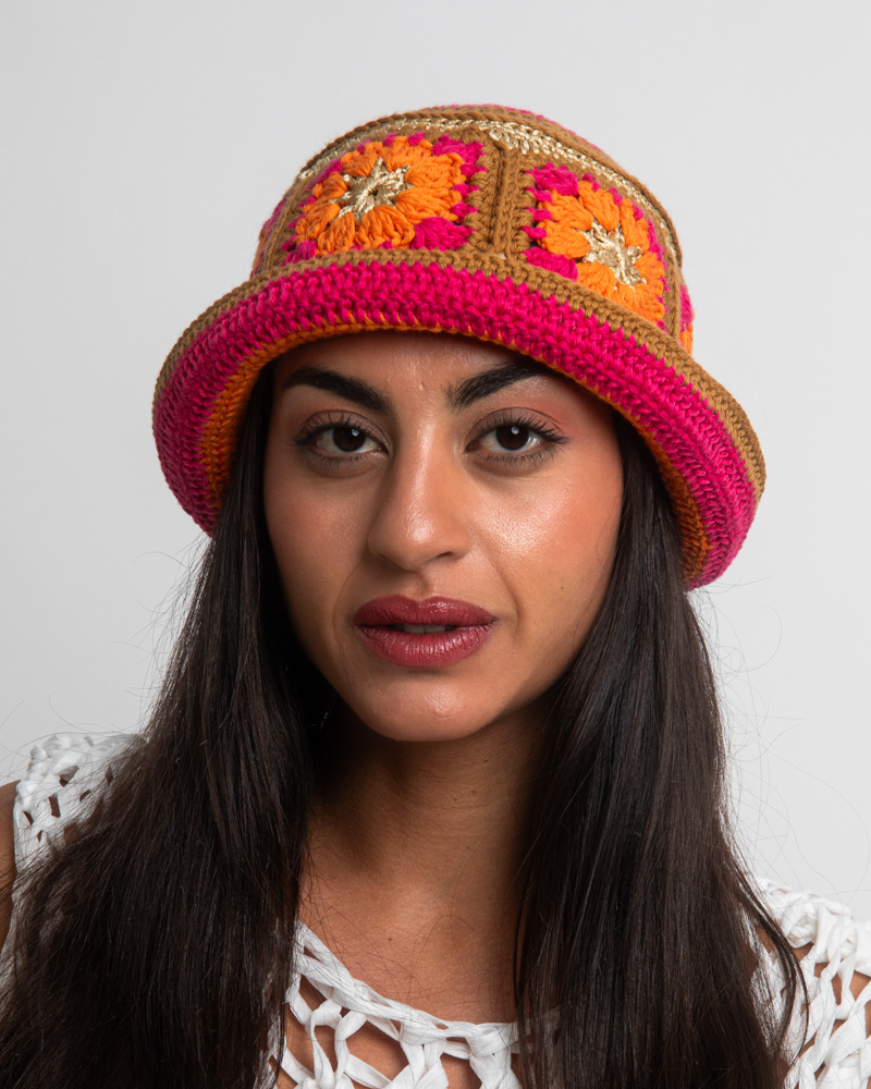 Knitted summer hat, patchwork of flowers, orange & fuchsia & beige