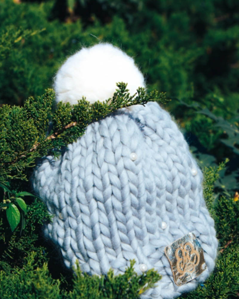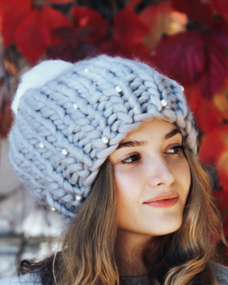 Pom pom gray hat with white pearls, merino wool 100% big loop